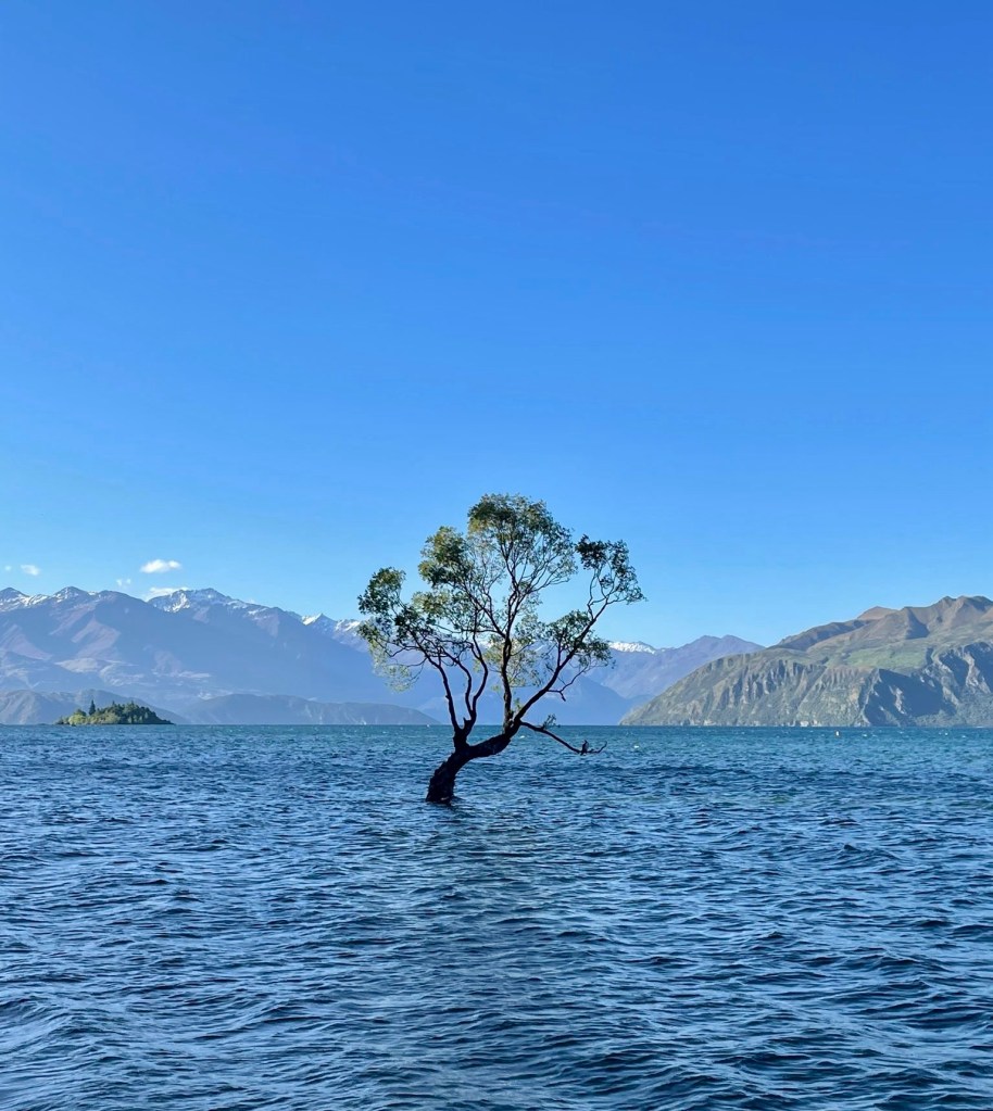 Lacul Wanaka e cunoscut pentru copacul din apa. E amuzat sa vezi cum stau turistii sa-l pozeze.