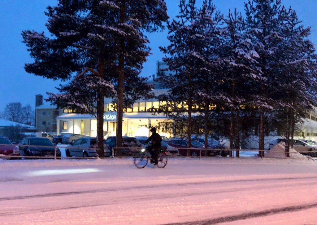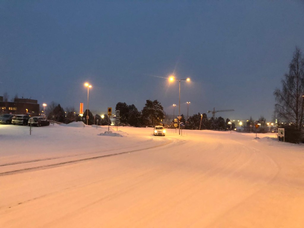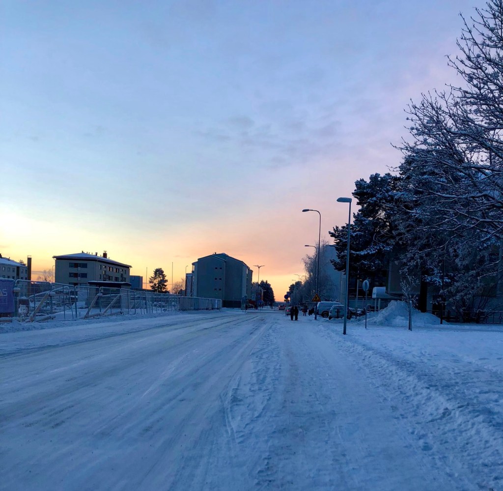 Cam asa ne-a intampinat Rovaniemi la ora 9 dimineata. Strazi cu strat de zapada permanent pe ele, lumina in scadere, insa fara vantul care m-a zapacit in Helsinki. Se pare insa ca zapada e putina anul asta, de obicei era cam 1m de zapada. Chiar sper sa ninga si sa continue sa fie asa.