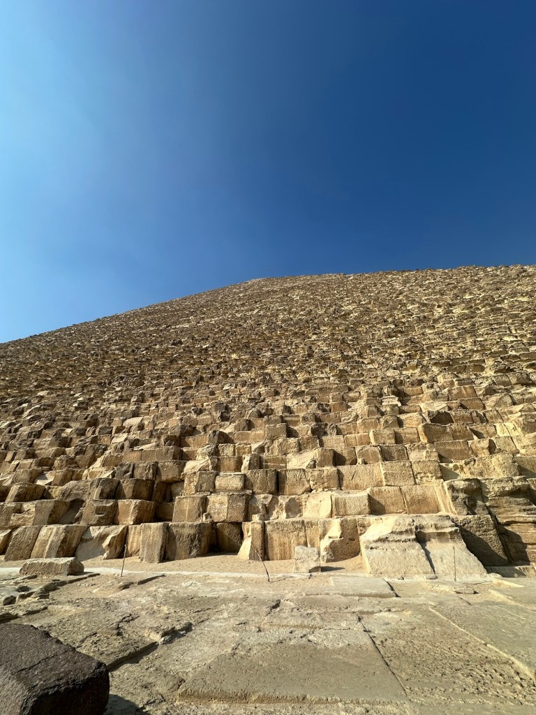 Blocurile de piatra de la baza piramidelor sunt perfect taiate si imbinate, asta pe langa dimensiunile lor. Si cand ridici ochii se te uiti spre varf realizezi ca la fel sunt toate cele peste 2,3 milioane de blocuri de piatra care compun marea piramida a lui Khufu (Kheops in greaca).